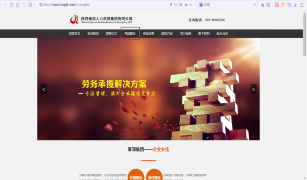 1.登錄陜西秦潤人力資源集團有限公司官網(wǎng)(網(wǎng)址:http://www.2e8o49aa0.com/),點擊“考試報名”。